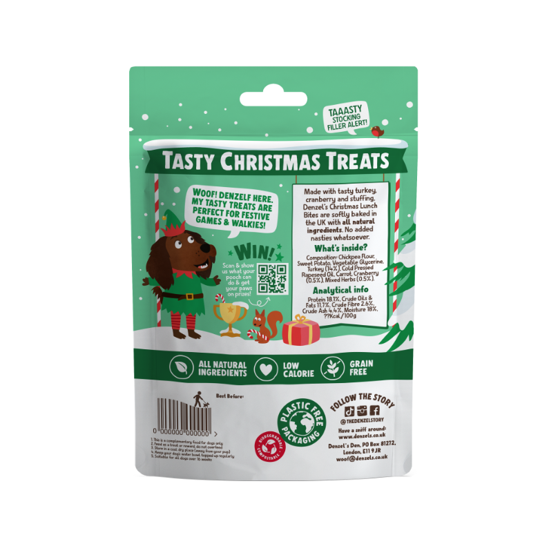 Denzel's soft, squishy bites are made from 100% natural ingredients, gently baked in the UK into tasty, bite-size treats. Don't worry they're low cal so perfect for training or on-the-go. Denzel's Christmas Lunch Bites are the ultimate way for your pooch to join in with the dinner this Christmas! Made with Turkey, Cranberries & stuffing, your dog will go crazy for these little tasty treats.