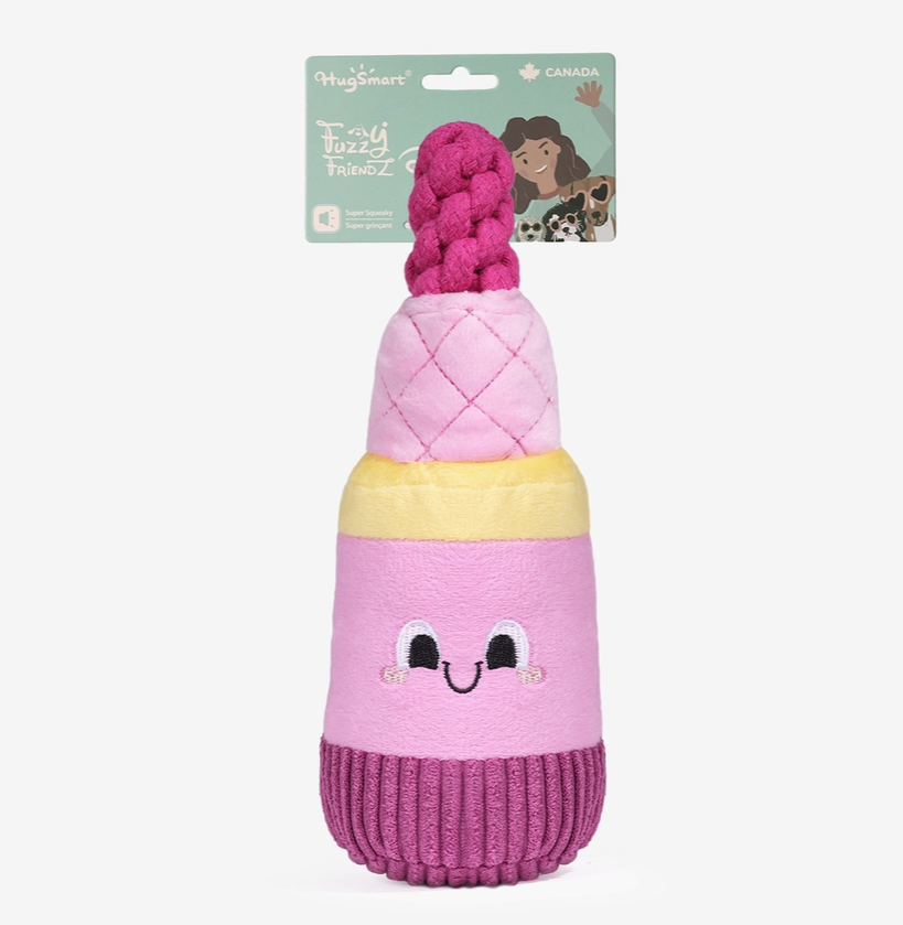 Your pup just found their new signature shade! This lipstick dog toy has a rope-woven top for tugging and chewing and a soft plush body with a squeaker inside. With its mix of textures, it makes every play session exciting. Features: • Rope-woven lipstick top for chewing fun. • Soft plush body with built-in squeaker. • Different textures make play more exciting. Dog Plush Toy size: 3.2”x3.2”x78.3”